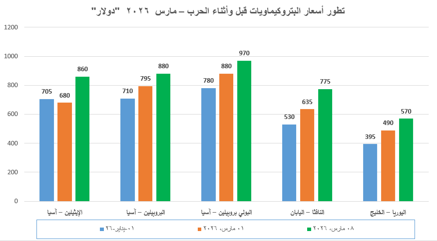 وفي المقابل، ارتفعت أسعار اللقيم بوتيرة ملحوظة، إذ صعد سعر النافثا اليابانية من نحو 635 دولارًا إلى 775 دولارًا للطن، بينما ارتفع البنزين في آسيا إلى نحو 970 دولارًا.