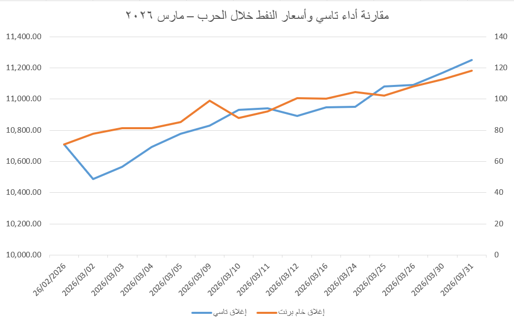 تكشف الأرقام هنا مفارقة واضحة؛ قبل اندلاع الحرب أنهى مؤشر تاسي جلسة 27 فبراير عند مستوى 10,709 نقطة، ليتراجع سريعًا إلى 10,475 نقطة في أولى جلسات الصدمة، قبل أن يعكس اتجاهه تدريجيًا ويغلق عند 11,249 نقطة بنهاية مارس، محققًا مكاسب تقارب 5% مقارنة بمستويات ما قبل الحرب.