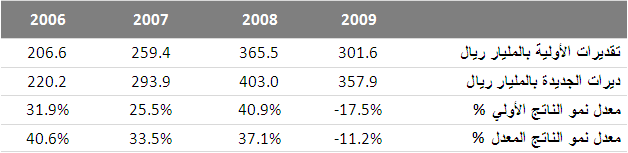 ويتضح من الجدول أن التقديرات المعدلة للناتج المحلي الإجمالي بالأسعار الجارية قد زادت في السنوات الأربع السابقة بشكل ملحوظ عن التقديرات الأولية المنشورة سابقاً، وذلك نتيجة إدخال منشآت جديدة لم تكن في إطار الجهاز عند إعداد التقديرات السابقة. ونتيجة لهذه الإضافات فإن معدلات النمو الاقتصادي المنشورة سابقاً قد تعدلت كما هو مبين في الجدول؛ وعلى سبيل المثال تقلص التراجع في النمو الاقتصادي بالأسعار الجارية لعام 2009 من-17.5%، إلى -11.2% فقط، كما تغيرت معدلات النمو للسنوات السابقة على النحو المبين في الجدول. وتغيرت أيضاً معدلات النمو الحقيقة ( أي التغير بالأسعار الثابتة)، بحيث كان هناك نمو حقيقي بمعدل 8.7% في عام 2009، و 25.4% في عام 2008 و 26% في عام 2007، و 18.6% في عام 2006.