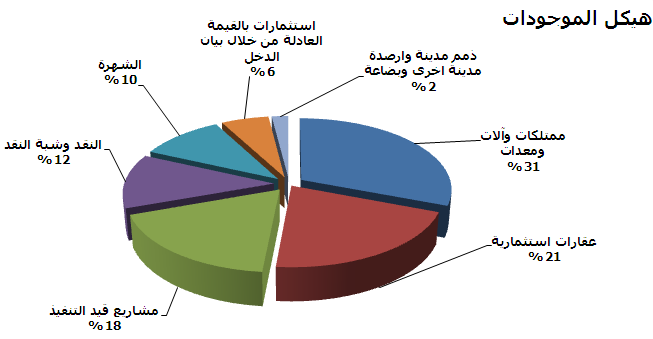 ويبلغ إجمالي موجودات "النوادي" نحو 18.4 مليون دك كما في نهاية 2009 ، ويتركز 31% من إجماليها في بند ممتلكات وآلات ومعدات بمبلغ 5.6 ملايين دك، ويليه بالأهمية، بند عقارات استثمارية بمبلغ 3.8 ملايين دك بما نسبته 21% من إجمالي الموجودات ، كما يشكل كلٌّ من بند مشاريع قيد التنفيذ وبند النقد وشبه النقد وبند الشهرة ما يعادل 18 و12 و10% على التوالي من إجمالي الموجودات بأرصدة تبلغ 3.4 و2.3 و 1.9مليون دك على التوالي، وذلك كما في 31/12/2009.