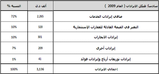 أما فيما يتعلق بقائمة الدخل، فقد بلغ إجمالي إيرادات "النوادي" نحو 3.1 ملايين دك، ويتركز 72% من إجماليها في بند صافي إيرادات الخدمات بمبلغ 2.3 مليون دك ، ويليه كلٌ من بند التغير في القيمة العادلة للعقارات الاستثمارية وبند إيرادات الإيجارات ما يعادل 10% لكل منهم من إجمالي الإيرادات بأرصدة تبلغ 320 و 301 ألف دك على التوالي.