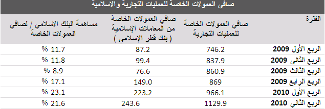 ويوضح الجدول التالي تطور صافي العمولات الخاصة التجارية والإسلامية ومدى مساهمة قطر الإسلامي في صافي العمولات خلال الفصول الأخيرة :