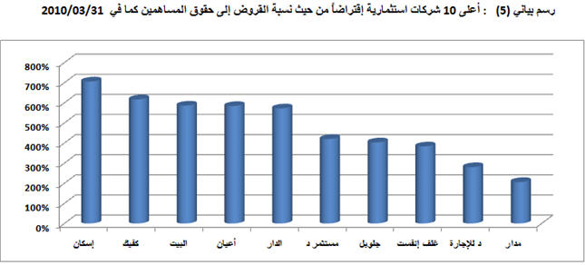 أما وفقا لمعيار نسبة القروض إلى حقوق المساهمين ، فقد بلغ متوسط تلك النسبة لقطاع الاستثمار 148% كما في 31/03/2010 ، وقد تصدرت " إسكان " النسبة الأعلى في هذا الصدد بمعدل 706% ، تلتها "كفيك" بمعدل 617% ، ثم "البيت" بمعدل 586% ، أما الشركات الأقل في هذا المعيار ، فقد كان من نصيب " صكوك" و "وطنية د ق" و " السورية " بمعدل 6 و15 و 16% على التوالي، وفاقت 14 شركة متوسط نسبة القروض إلى حقوق المساهمين لقطاع الاستثمار ، وذلك بما يعادل 27% من إجمالي عدد شركات الاستثمار، بينما انخفضت تلك النسبة في باقي الشركات الاستثمارية وعددها 37 شركة بما يعادل 73% من شركات القطاع.