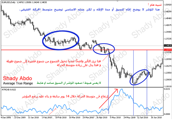 طور هذا المؤشر بواسطة J. Welles Wilder , مؤشر متوسط المدى الحقيقى عبارة عن مؤشر يقيس متوسط التذبذب ( تقلبات الاسعار خلال مدة زمنية معينة ) , يفيد هذا المؤشر المتعاملين مع سوق الفوركس حيث يظهر كيف كان التذبذب فى الماضى و حتى الوقت الحاضر حتى يستعد المتعاملين للمتاجرة الفعلية فى السوق حيث ينبهك إلى زيادة حجم الحركة او انحسارها خلال فترة معينة معينة تحددها من إعدادات المؤشر بالتالى نجد ان هذا المؤشر مفيد جدا فى هذا السوق و خصوصاً لمن يريد معرفة متوسط المدى الحقيقى فى سهم او سلعة او زوج عملات.