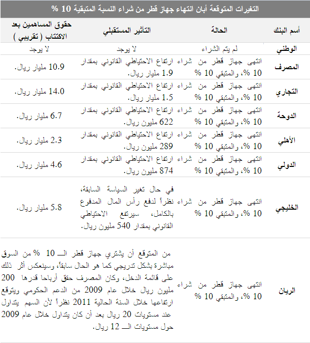 أما البنوك الأخرى، ينتظر أن تنعكس تلك الزيادة على حقوق المساهمين لدى البنوك مع ارتفاع الاحتياطي القانوني بمقدار علاوة الإصدار عدا الريان والذي ينتظر أن تنعكس تلك الزيادة على قائمة الدخل مباشرة، والجدول التالي يوضح أهم تلك البيانات في حال تم الشراء خلال الربع الأول كما أورد جهاز قطر للاستثمار: