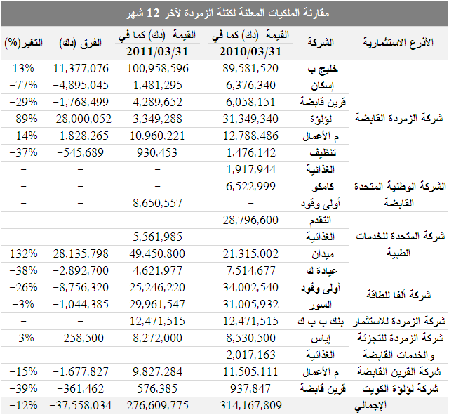 وتجدر الإشارة إلى أن المصدر الأولي للبيانات أعلاه هو الموقع الالكتروني لسوق الكويت للأوراق المالية ، أما عملية تصنيف تبعية الحصص في الشركات لكتلة "الزمردة" فهي بناء على اجتهادنا الخاص ، والذي قد لا يتفق مع وجهة نظر البعض رغم بذلنا لجهود مناسبة في هذا الصدد ، علما بأن الملكيات أعلاه هي لما يساوي أو يزيد عن 5% من رأس مال الشركات المدرجة ، ولا يشمل ما دون ذلك ، حيث نتوقع وجود ملكيات أخرى لكتلة "الزمردة" في الشركات المدرجة بما يقل عن 5% من رأس مال بعض الشركات.