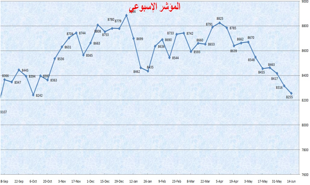 انخفض المؤشر العام في أربعة أيام، وارتفع في يوم واحد فقط، وخسر في محصلة تداولات الأسبوع ما مجموعه 63.6 نقطة وبنسبة 0.77 % دون إقفال الأسبوع السابق، ليصل إلى مستوى 8252.4 نقطة. وانخفض مؤشر جميع الأسهم بنحو 13.3 نقطة وبنسبة 0.66% ليصل إلى مستوى 1992.5 نقطة، وهو أدنى مستوى له منذ تدشينه في الأول من إبريل الماضي. وجاء الانخفاض في المؤشر العام ومؤشر جميع الشركات، محصلة لانخفاض أسعار أسهم 25 شركة، وارتفاع أسعار أسهم 16 شركة، وبقاء سعر سهم شركة واحدة بدون تغير. ومن حيث التصنيف القطاعي؛ انخفضت كل المؤشرات القطاعية بنسب مختلفة؛ حيث انخفض مؤشر قطاع الاتصالات بنسبة 2.47%، ثم مؤشر قطاع البنوك بنسبة 1.04%، ثم مؤشر قطاع الصناعة بنسبة 0.43%، فمؤشر قطاع السلع بنسبة 0.24%، في حين ارتفع مؤشر قطاع العقارات بنسبة 0.93%، ثم مؤشر قطاع النقل بنسبة 0.34%، فمؤشر قطاع التأمين بنسبة 0.23%.