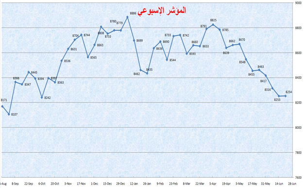 ارتفع المؤشر العام في يومين وانخفض في ثلاثة أيام ، وكسب في محصلة تداولات الأسبوع ما مجموعه نقطة واحدة ظل بها عند مستوى 8253.5 نقطة. وانخفض مؤشر جميع الأسهم بأقل من نقطة واحدة إلى مستوى 1991.5 نقطة، وهو أدنى مستوى له منذ تدشينه في الأول من إبريل الماضي. وجاء الاستقرار في المؤشر العام ومؤشر جميع الشركات، محصلة لانخفاض أسعار أسهم 19 شركة، وارتفاع أسعار أسهم 21 شركة، وبقاء أسعار أسهم شركتين بدون تغير. ومن حيث التصنيف القطاعي؛ ارتفعت أربع من المؤشرات القطاعية بنسب مختلفة؛ حيث ارتفع مؤشر قطاع الاتصالات بنسبة 1.45%-رغم تراجع سعر سهم كيوتيل بنسبة 1.57%- ثم مؤشر قطاع العقارات بنسبة 0.31%، فمؤشر قطاع البنوك بنسبة 0.2%، ثم مؤشر قطاع النقل بنسبة 0.01%، وفي المقابل انخفض مؤشر قطاع السلع الاستهلاكية بنسبة 0.60%، ثم مؤشر قطاع التأمين بنسبة 0.24%، فمؤشر قطاع الصناعة بنسبة 0.17%.