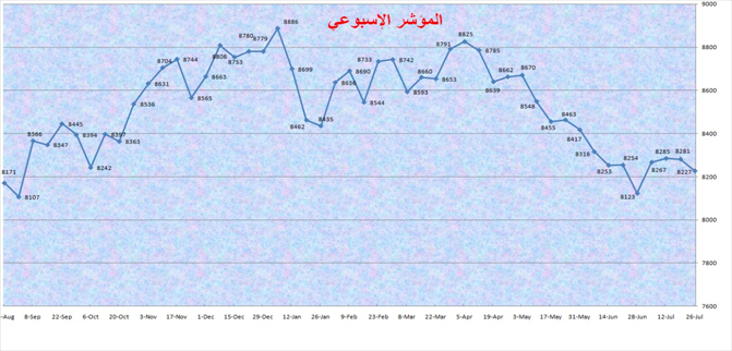 انخفض المؤشر العام خلال الأسبوع بما مجموعه 54.5 نقطة وبنسبة 0.66% ليصل عند الإغلاق يوم الخميس إلى مستوى 8226.8 نقطة واقترب المؤشر بذلك من حاجز الدعم عند مستوى 8200 نقطة. وانخفض مؤشر جميع الشركات بنحو 9.4 نقطة وبنسبة 0.47% إلى مستوى 1984.65 نقطة. وجاء التراجع في المؤشرات ، محصلة انخفاض أسعار أسهم 21 شركة، وارتفاع أسعار أسهم 12 شركة، وبقاء أسعار أسهم 9 شركات بدون تغير. وقد توزع الانخفاض بنسب محدودة على عدد كبير من الشركات حيث انخفض سعر سهم كيوتيل بنسبة 2.1%، وانخفض سعر سهم صناعات بنسبة 1.7%، وانخفض سعر سهم التجاري بنسبة 1.6%، في حين سجل سعر سهم المواشي ارتفاعاً بنسبة 12.7%، وسجل سعر سهم الرعاية ارتفاعاً بنسبة 6.2%، وارتفع سعر سهم المخازن بنسبة 4.3%.