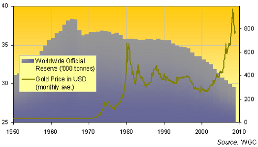 تمتلك البنوك المركزية ما مجموعه 20 في المائة من الذهب الموجود على الأرض، وهي تمتلك حصة أكبر بكثير من هذه عند النظر إلى الذهب من منظور الأغراض المالية (بمعنى استثناء الحُليّ وغيرها). ومن ثم فإن ردود أفعال البنوك المركزية ربما تكون ذات أهمية أكبر بكثير مما إذا كان الناس يقومون بشراء الذهب أم لا. وتشير الدلائل التاريخية إلى أن: (1) البنوك المركزية لا تحب الذهب؛ لأنه عادة ما يدل على أن البنوك المركزية لم تحسن الأداء. (2) والبنوك المركزية تميل إلى التصرف على نحو يساير الدورة الاقتصادية (procyclical) في سوق الذهب (ثمة مثال توضيحي على ذلك هو القرار الأحمق من جانب جوردون براون (Gordon Brown) ببيع الذهب وهو عند أدنى مستوياته منذ أربعين سنة). فإذا نظرنا إلى الرسم البياني التالي، الصادر عن مجلس الذهب والذي يوضح الحيازات الرسمية من احتياطيات الذهب، يتضح لنا أنها ساعدت على مفاقمة أوضاع السوق الانخفاضية بالنسبة للذهب في الفترة بين عامي 1990 و2002 من خلال بيع الذهب، وأنها راكمت الذهب عند الارتفاع الكبير في الأسعار حتى سنة 1973.